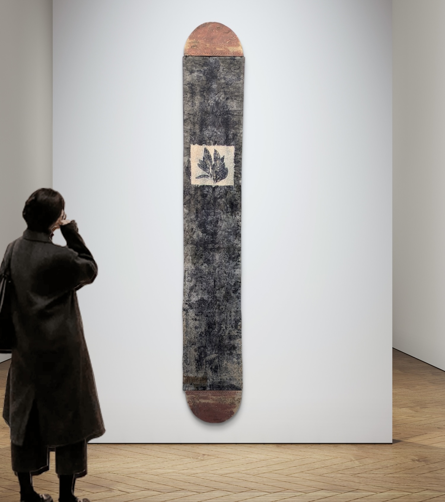 Vegginstallasjon av rester fra eco-printet tekstil, vokset overflate.